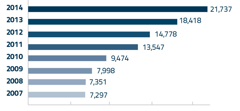 As the number of applicants continues to climb, the university has become more selective and drawn an increasing number of students from around the United States and the globe. This year first-year students came from 911 high schools, a 48 percent increase since 2009. And the number of first-year international students has grown 75 percent during that same time.