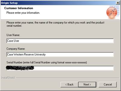 Keep this browser window open when you start Origin 9.0 for the first time, as a reference for the product activation procedure, that is initiated the first time Origin 9.0 runs. When registering and activating Origin, you will be asked to create an account on the OriginLab web site if you do not already have an account. When creating an account, make sure you use “Case Western Reserve University” for the company name and that you enter a valid Case Email address. If you already have an OriginLab web account, make sure it also follows this criteria. Update your account if needed by first logging into the OriginLab website (www.originlab.com) and then click “View/Update User Profile Details”.