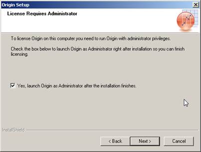 Leave the “Launch Origin now as administrator to complete licensing” check box selected to start Origin and obtain your computer-specific license.