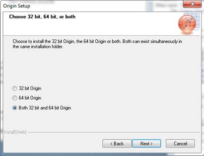 If you are installing on Windows 64-bit, you can install both 32-bit and 64-bit Origin. Install both unless you have a space limitations. Press Next.